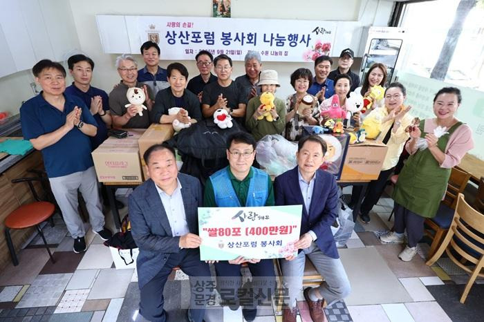 재경상주시향우회 상산포럼(회장 성창진)봉사회(회장 김용목)는 9월21일(일) 다가오는 추석을 앞두고 수원시 장안구 연무동 소재 수원나눔의집을 방문하여 사랑의 쌀 80포(400만원상당)와 칫솔, 그리고 각종 생필품과 의류를 전달하여 주변을 훈훈하게 하였다.
