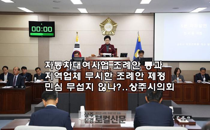 이번 회기에서 ㅈ의원은 상주시 자동차대여사업 등록기준안을 완하하는 조례안을 대표 발의하면서 지역 기존 업체들로 부터 반발을 사고 있다.